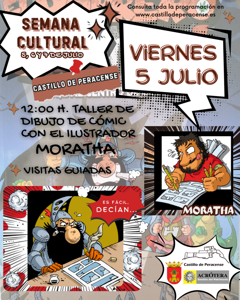 Viernes 5 de julio: a las 12:00h el ilustrador de cómics Moratha nos enseñará a dibujar este tipo de publicaciones. Algunas de sus obras podéis encontrarlas a la venta en nuestra tienda del castillo editadas por «Acrótera Ediciones». Además tendremos disponibles las habituales visitas guiadas al castillo.