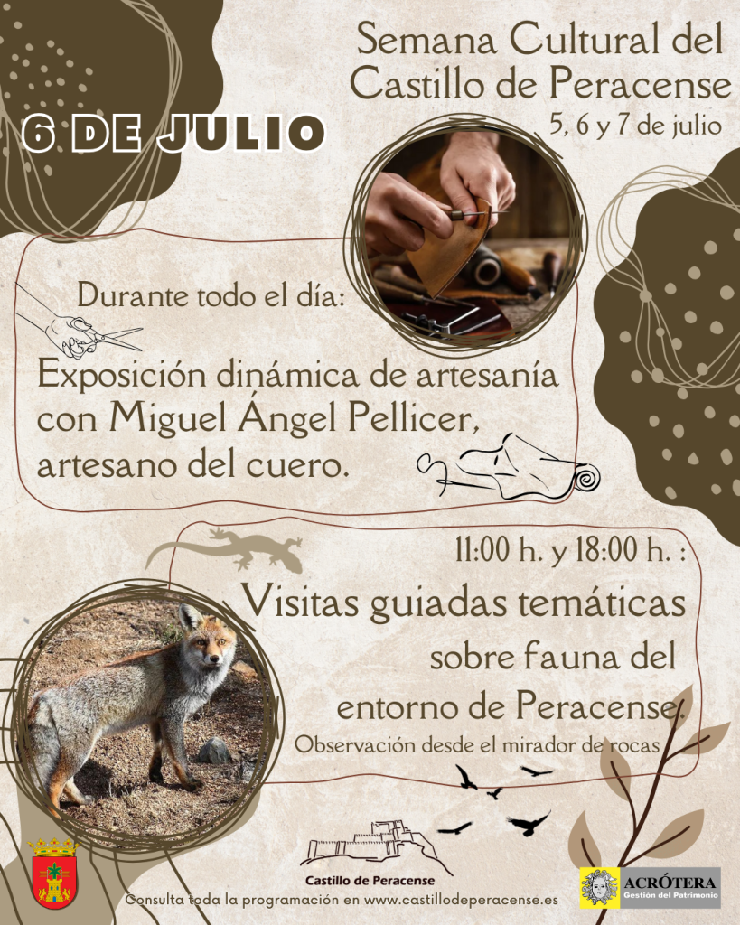 EDITAMOS: Por motivos ajenos a la organización, las visitas temáticas sobre fauna se realizarán desde el castillo hasta el mirador de rocas (acceso desde el parking) en lugar de hasta la aldea de «Los Casares». Desde este mirador, observaremos la imponente silueta del castillo a la vez que aprendemos sobre los animales que pueblan el entorno. Horario de visitas: 11:00h y 18:00h (horario sujeto a cambio según climatología)